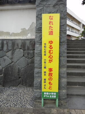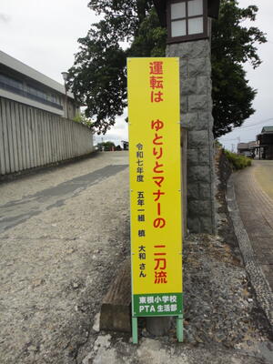 これは,春休みに交通安全の標語を募集し,優れた作品を看板にしたものです。今年は,校門から校舎の西側に4枚,グラウンドの南側に1枚,合計5枚の看板を設置しました。この看板を見て,事故なしが続くといいです。