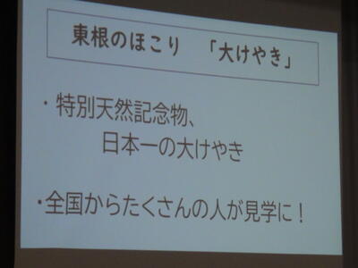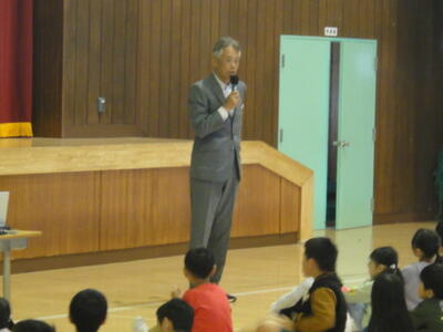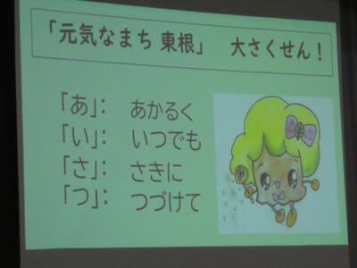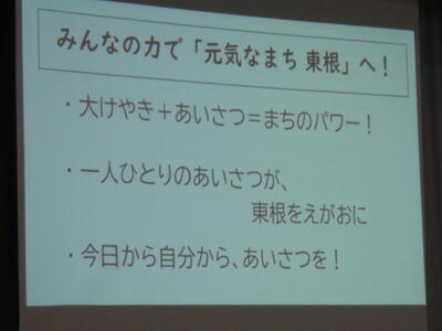 次に,「東根のほこりは,日本一の大けやきと東根小のみんな」「あいさつの力は,相手や自分を幸せにできる」と話しました。だから,「『元気なまち東根』大さくせん」であいさつに取り組もうと伝えました。