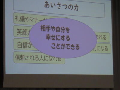 「あいさつは,一番かんたんな思いやりの言葉,人と人をつなぐ魔法の言葉」ということを伝えました。