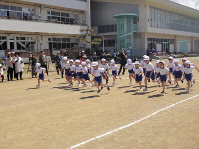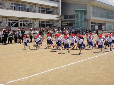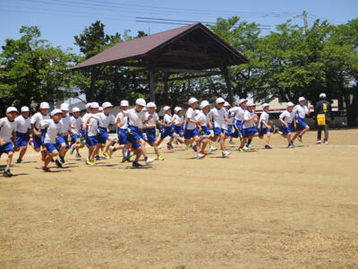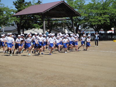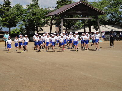 スタートの合図とともに走り出しました。天候が良かったため,汗も出てくるし,だんだん疲れもたまってきます。けれども,そうしたことに負けないで一生懸命に走る姿が見られました。コースの横では,おうちの方々も応援してくださり,励みになりました。