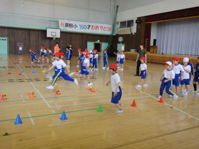 初めに,音楽に合わせてウォーミングアップダンスを行い,体をほぐしました。次にラダーなどを使ったトレーニングです。ラダー(はしご状の器具),ミニハードル,ミニコーンなどを使って,心拍数を高める運動です。子どもたちは,8種類の器具に挑戦しながら,楽しく体を動かしていました。