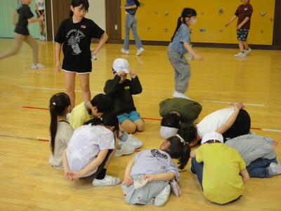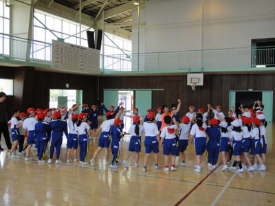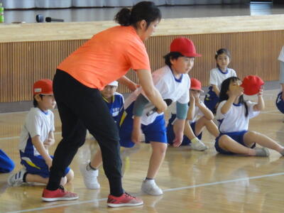 最後は,「何ごとにも挑戦していってほしい。」という先生のお話の後に全員でまるくなって「できる,できる,できる。」と声を掛けて終了しました。子どもたちは十分に体を動かして,とても楽しく運動できました。五十嵐さん,ご指導どうもありがとうございました。