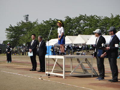 開会式で,本校の代表児童が,「市内9校の児童が一同に集い,仲間と共に挑戦する日です。」と開会のあいさつを述べて,陸上競技記録会の日程がスタートしました。