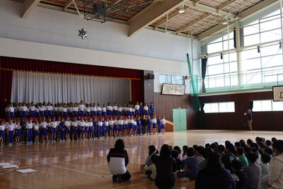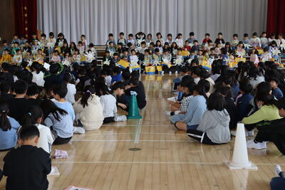 1校時、4年生を中心に校内陸上記録会の壮行式が行われました。