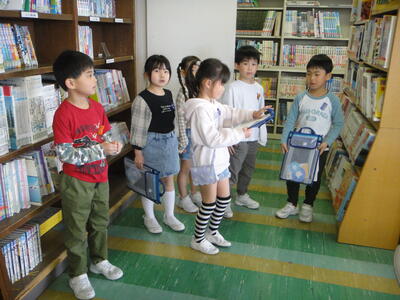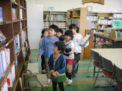 これは,生活科の「学校たんけん」の学習として,2年生が1年生に学校の案内をするという活動です。小グループ毎に2年生が1年生の手を引いて移動します。目的の場所に着いたら,「ここは,高学年図書室です。高学年の人が読む本がたくさんあります。」というように,予め調べて紙に書いておいたことを説明します。1年生は,その話をしっかり聞いていました。