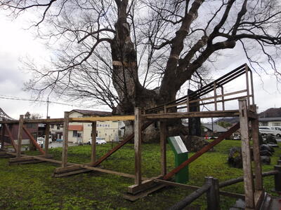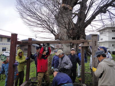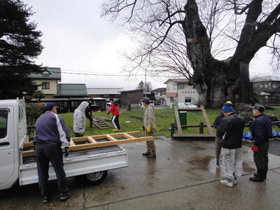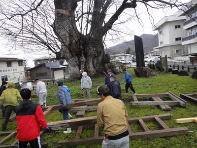 小雨の中,朝6時から1時間程作業していただき,完成しました。今後,4月29日(火)の昭和の日に6年生が行う大けやき横綱パレード終了後,この台の上に大けやき横綱を設置し,地域の方や観光客の皆様に見ていただくことになります。