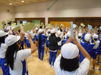 雨天でグラウンドが使えないため,場所は,赤組が大体育館,白組が小体育館です。赤組・白組とも応援団員の号令に合わせて,「エール」「コール」などの練習を行いました。昨日の結団式の熱気そのままに,うちわを使った振り付けを合わせ,大きな声で練習することができました。