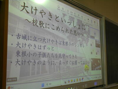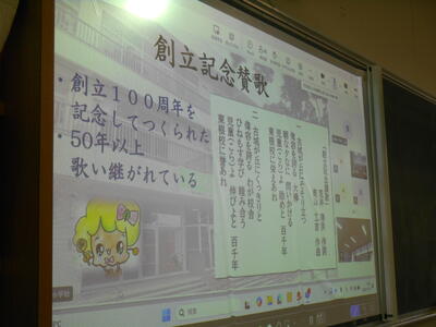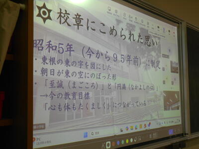 給食の時間に学校長が東根小学校創立に関わる話をしました。