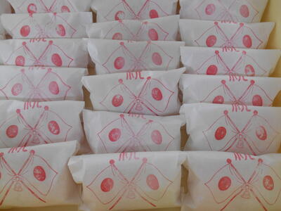 それから,紅白のお饅頭を一人に1個ずつ渡しました。おうちに帰って,おうちの人と一緒に食べるようにと伝えたところです。東根小学校のことを思いながら、おいしく食べていただきたいと思います。