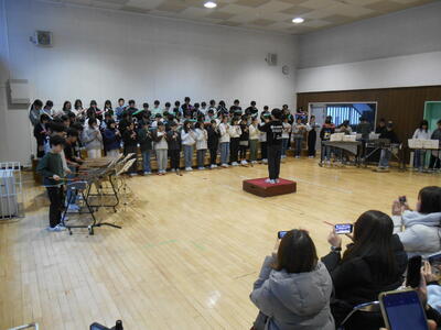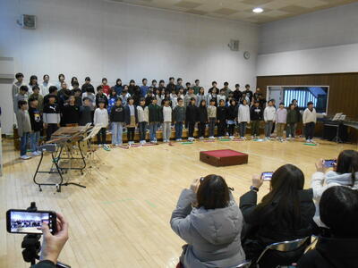 次は,小体育館に全員が集合して合奏「木星」,合唱「いのちの歌」を披露しました。最高学年にふさわしい上手な合奏と「命」に対する思いがこもった合唱でした。感動をありがとう!