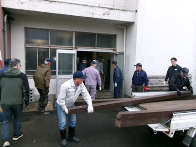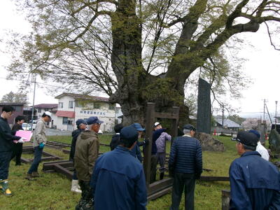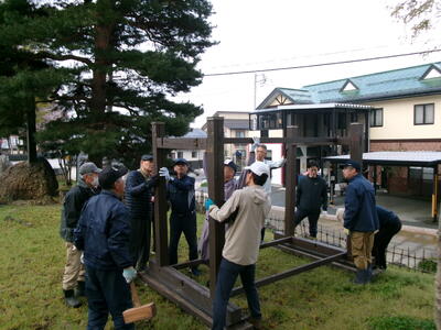 この横綱は、昨年度の2月に、大けやき横綱づくり実行委員会の皆様と現6年生児童、その保護者の方々で作りました。今月29日に学区内をパレードした後に、この横綱台に掲げます。