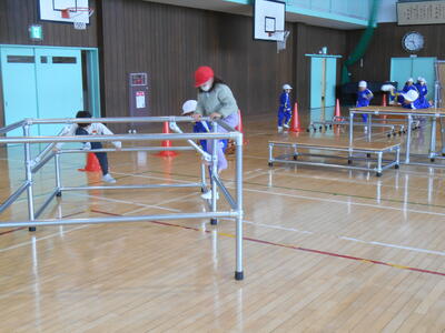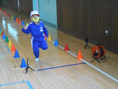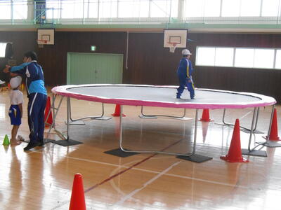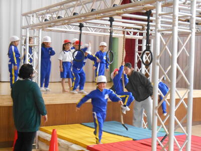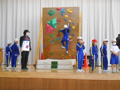 実施するスポーツは,ボルダリング,パルクール,トランポリン,スヌークボール,短距離走20M,オブスタクル(障害物クリア)で,今日は1・2年生が挑戦です。