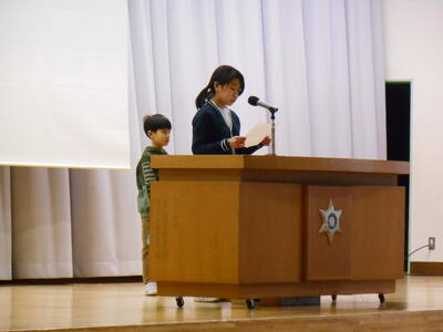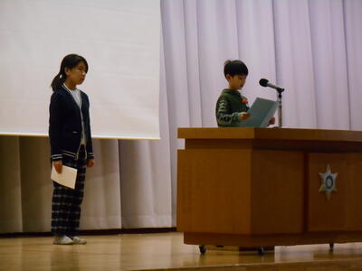 初めに,1年生と4年生の代表児童が2学期に「楽しかったこと」や「頑張ったこと」などを発表しました。