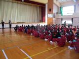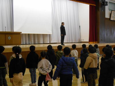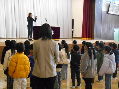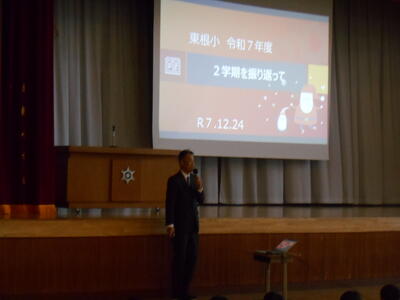 次に校長が,「2学期を振り返って」と題し,各学年が秋の授業参観で発表した内容を中心に表現力が伸びたことなどを伝えました。