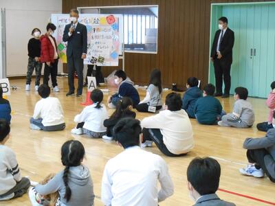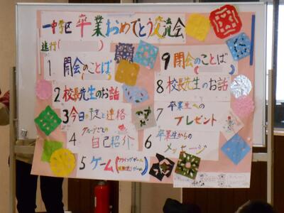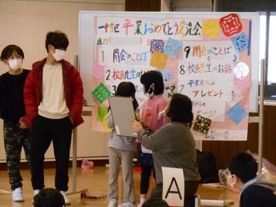 本校の児童が式次第の紙を作ったり,進行,開・閉会式のあいさつをしたりして活躍しました。また,ゲームや卒業生へのプレゼント渡しなどをして,楽しい時間を過ごしました。