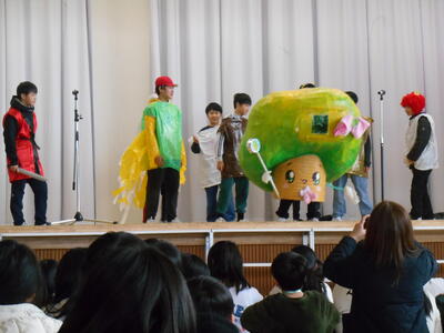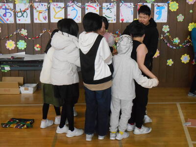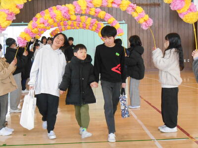 3年生が準備した花のアーチの下をくぐり,4年生が飾った体育館に6年生と1年生が手をつないで入場しました。その後,○×クイズやつないだ手を離さないようにしながら班員で輪になるゲームなどをしました。そして,班員と6年生でプレゼントし合ったり,6年生は劇の形でメッセージを伝えたりしました。