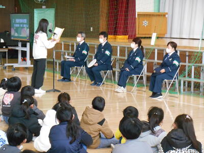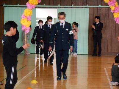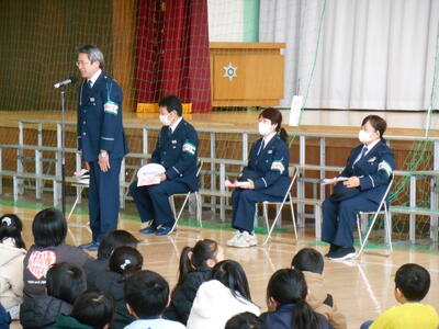 入場後,児童代表がお礼の言葉を伝えたり,お礼の手紙を渡したりしました。その後,交通指導員さんから登校時の安全面についてお話していただきました。