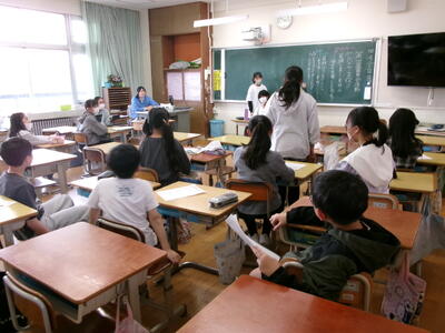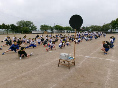 記録会に先立って1校時目に陸上記録会の壮行式を行いました。4年生が企画し,1年生から4年生が声を合わせて5・6年を応援しました。心のこもった応援ができました。